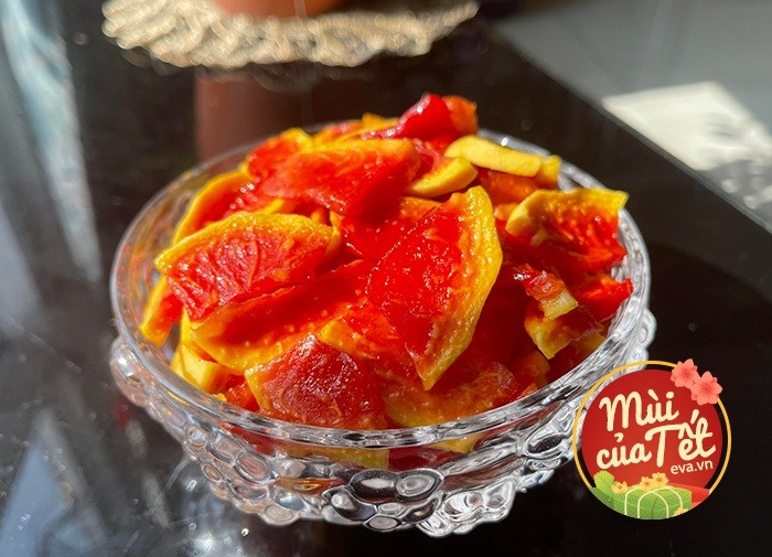 Lấy mứt ra để nguội, cho vào hộp là được. Những miếng đu đủ dai dai, ngọt nhẹ, thơm mùi chanh leo thực sự hấp dẫn.