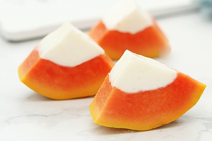 - Thưởng thức: Khi thạch đã đông, lấy đu đủ ra khỏi tủ lạnh, cắt thành từng khoanh. Thành phẩm giống như panna cotta sữa nằm trong lớp đu đủ chín mềm mát lạnh, ngọt dịu, rất hợp ăn vào những ngày nóng.