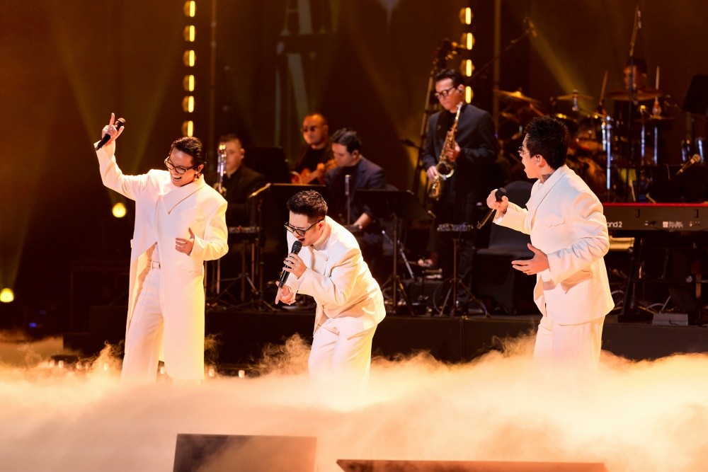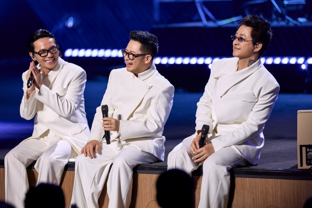 Giống như gần 3 thập kỷ trước, "anh cả" Bằng Kiều vẫn đứng ở vị trí trung tâm, 2 "cậu em" Tuấn Hưng, Anh Tú sôi nổi bên cạnh.