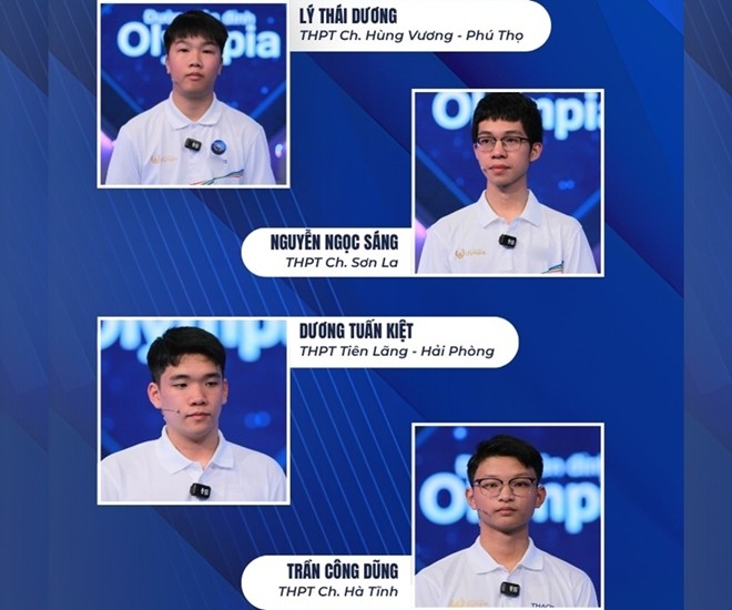 Như vậy, danh sách thi quý 2 Olympia 2026 đã được xác định là: Đoàn Trí Anh (THPT Đan Phượng - Hà Nội), Nguyễn Sư Minh Khôi (THPT Đông Hà - Quảng Trị), Lý Thái Dương (THPT chuyên Hùng Vương - Phú Thọ) và Trần Nguyên Đức (THPT Chuyên Khoa học Tự nhiên - Hà Nội).