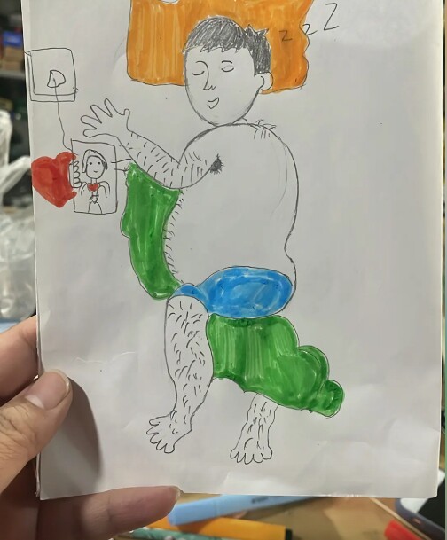 Tuy nhiên, cũng có một số phụ huynh chủ quan trong vấn đề này, dẫn đến những tình huống để con tận mắt chứng kiến “thói hư tật xấu” của mình. Điển hình như ông bố trong bức tranh con gái tiểu học vẽ dưới đây.