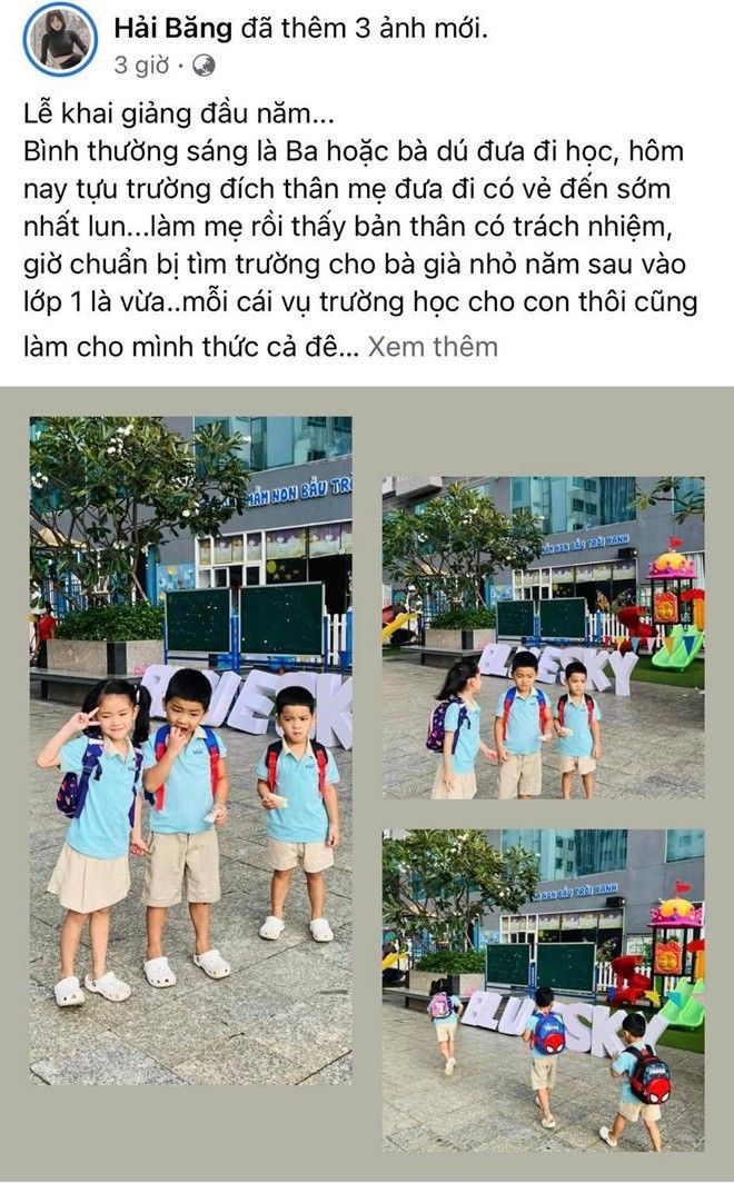 Trong khi đó, nữ ca sĩ Hải Băng khiến dân tình bật cười khi đăng ảnh 3 con cưng kèm dòng chú thích than thở vì đẻ nhiều. "Lễ khai giảng đầu năm. Bình thường sáng là ba hoặc bà vú đưa đi học, hôm nay tựu trường đích thân mẹ đưa đi có vẻ đến sớm nhất luôn. Làm mẹ rồi thấy bản thân có trách nhiệm, giờ chuẩn bị tìm trường cho bà già nhỏ năm sau vào lớp 1 là vừa.