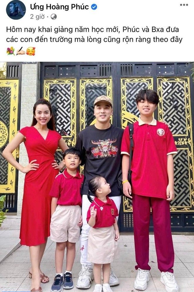 Ưng Hoàng Phúc và bà xã Kim Cương đưa 3 con đến trường. Cả gia đình diện đồ ton-sur-ton trông cực kỳ nổi bật.