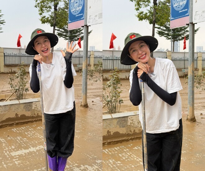 Hoa hậu Kiều Duy gây tranh cãi khi mặc áo trắng đi dọn bùn sau lũ ở Thái Nguyên.
