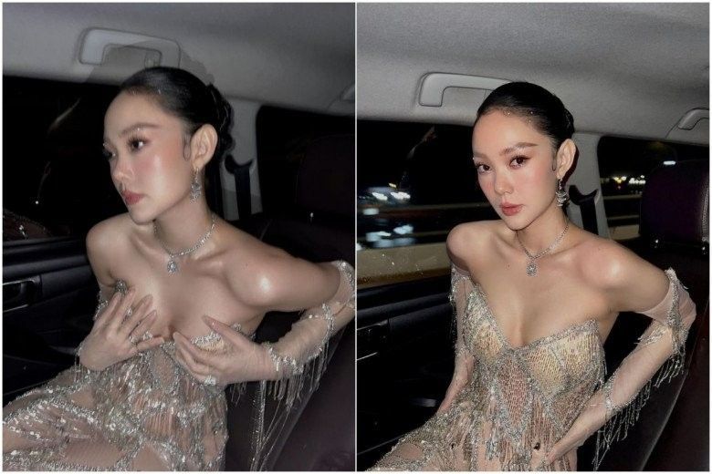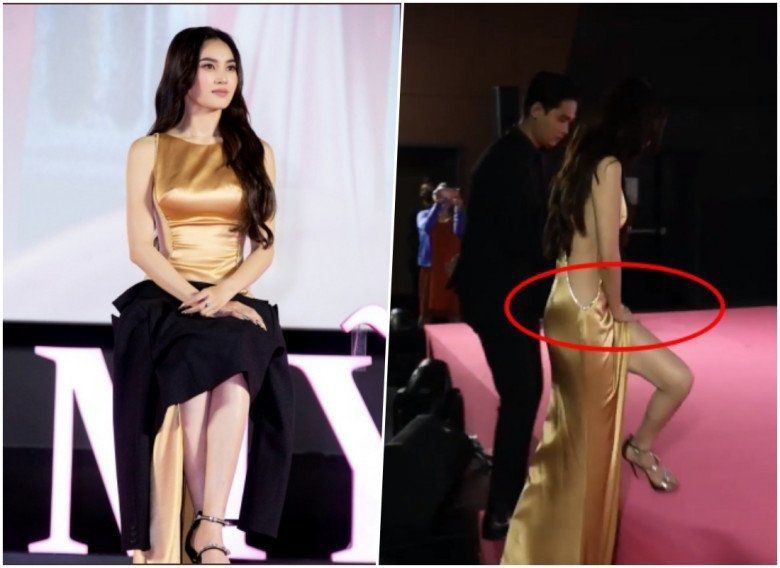 Với Ninh Dương Lan Ngọc khi kết thân kiểu váy xẻ tà tương tự, cô không chỉ dùng tay cố định tà áo khi bước lên bậc mà còn phải dùng khăn che đùi khi ngồi để ghi điểm tinh tế hơn.