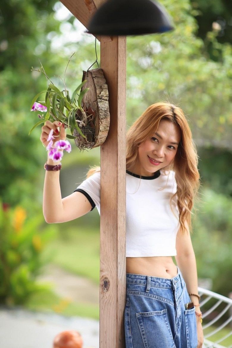 Người đẹp cũng trang điểm nhẹ nhàng, làm tóc xoăn lơi xinh như cô tiên trong vườn cây. Điểm nhấn thú vị khác của outfit làm vườn này của nữ ca sĩ gốc Đà Nẵng còn là chiếc quần được biến tấu ngược từ sau ra trước.