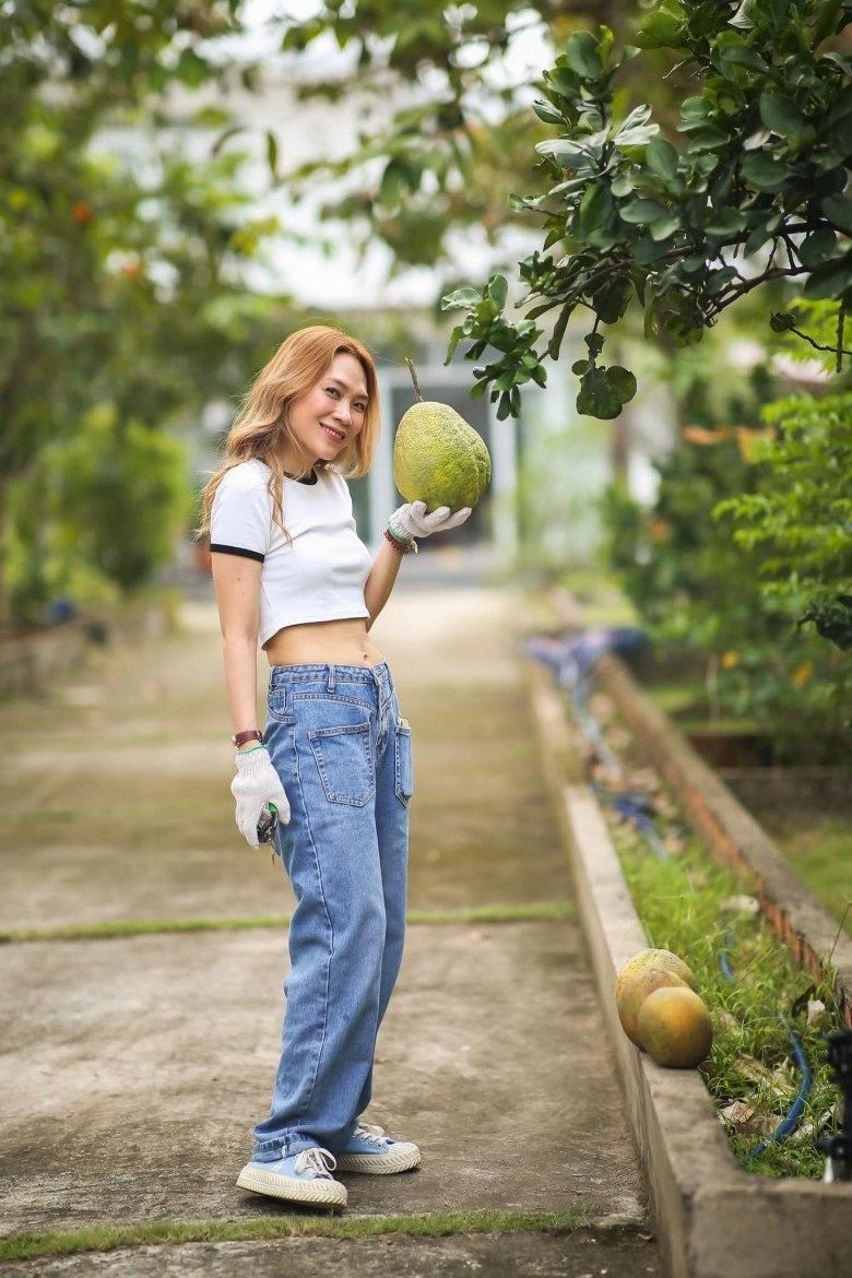 Cũng là đi cắt bưởi nhưng giờ cô đã không thoải mái hay xuề xòa với váy áo rộng rãi nữa. Người đẹp lựa chọn chiếc áo croptop mix cùng quần jeans phô diễn vòng 2 săn chắc, mi nhon.