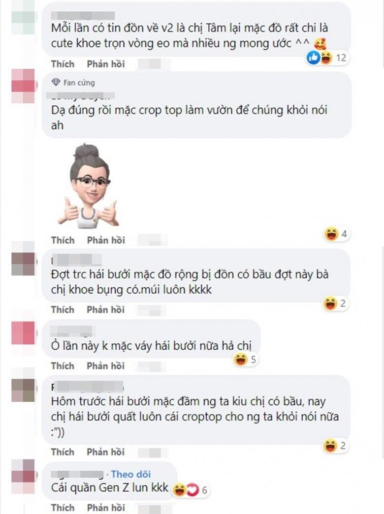 Bên dưới bài đăng của mỹ nhân sinh năm 1981, netizen lần lượt bày tỏ quan điểm thích thú cho set đồ của nữ ca sĩ. Ai nấy thấy phấn khích vì nay đi cắt bưởi, cô không bị đồn là có bầu bí nữa. Nhiều chị em cười ngả nghiêng khi mỗi lần có tin đồn về vòng 2 là Mỹ Tâm lại mặc đồ rất dễ thương, cắt ngắn đúng chỗ và khoe khéo được đặc điểm hình thể ngầm đính chính thị phi.