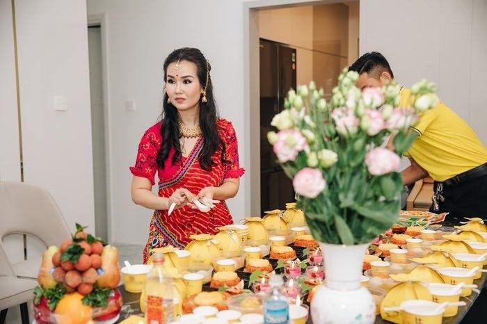 Ca sĩ Võ Hạ Trâm mặc trang phục Ấn Độ trong ngày làm lễ cúng thôi nôi con gái.