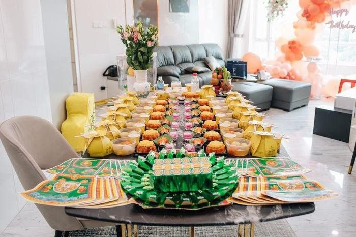 Tất cả được chuẩn bị với màu sắc hồng đỏ làm trung tâm và vàng xanh làm màu phía ngoài, bên cạnh đó là xen kẽ màu xanh ngọc bích mát mắt. Mâm lễ được đặt cúng tại không gian phòng khách của căn biệt thự nhà Vân Hugo cho thêm phần trang trọng. Chính vì thế càng cảm nhận được sự xa hoa, sang trọng và quý phái của tiệc mừng thôi nôi bé Vừng.