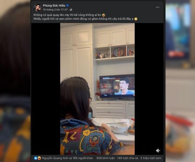 Mới đây, trên trang cá nhân, Phùng Đức Hiếu đã đăng tải video dài gần 4 phút, ghi lại phản ứng hài hước của bà xã – MC Thuỳ Linh khi xem cảnh tình cảm của nam diễn viên trong phim Gió Ngang Khoảng Trời Xanh. Anh đăng kèm dòng chú thích: “Không có quả quay lén này thì kể cũng không ai tin. Nhiều người hỏi vợ xem phim mình đóng có ghen không thì câu trả lời đây ạ”.