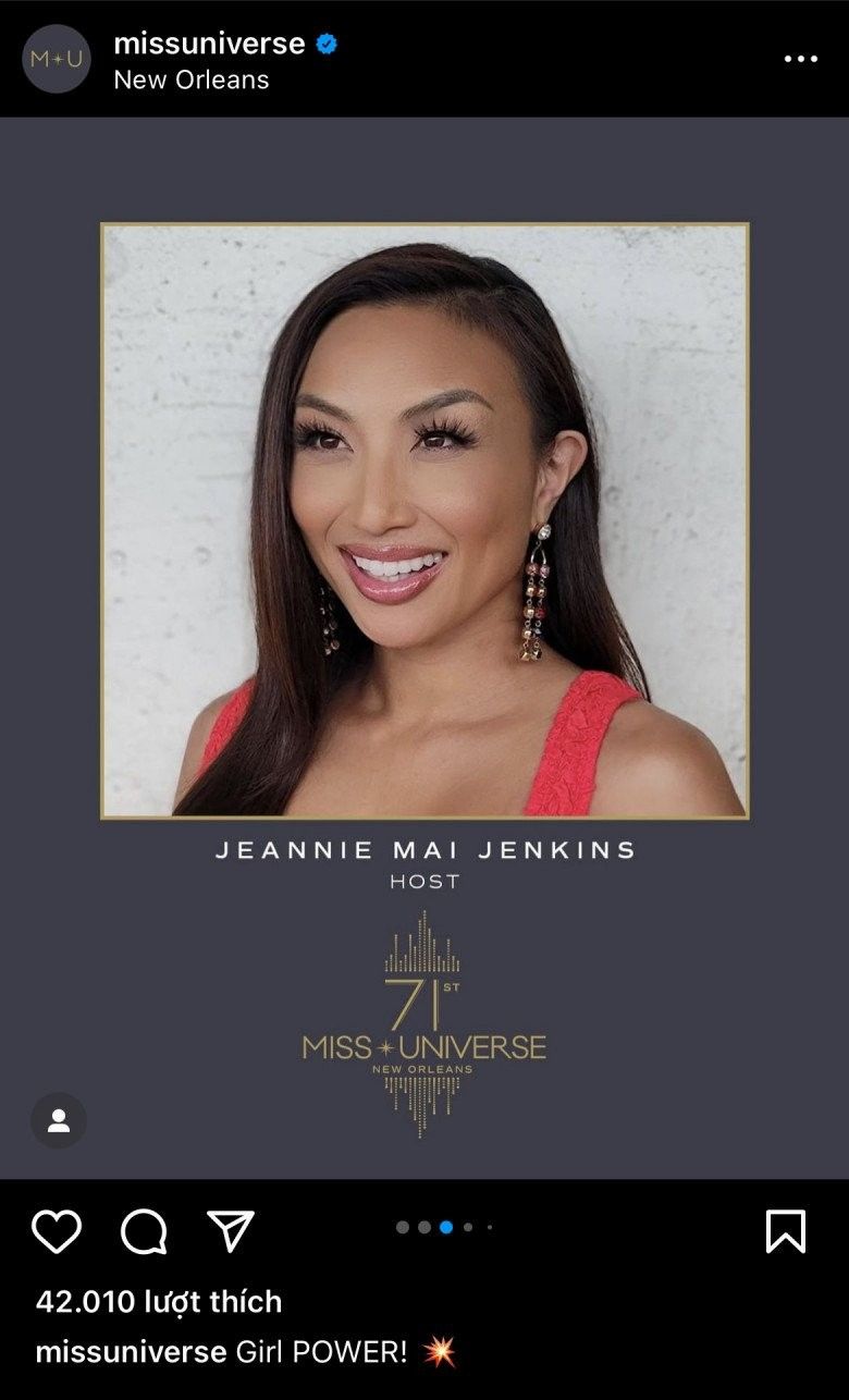 Mới đây, BTC cuộc thi Hoa hậu Hoàn vũ 2022 (Miss Universe) vừa chính thức thông báo 4 mỹ nhân cầm trịch dẫn dắt chương trình lần này gồm: Hoa hậu Hoàn vũ 2012 Olivia Culpo, Hoa hậu Hoàn vũ 2018 Catriona Gray, ngôi sao truyền hình Zuri Hall và đáng chú ý nhất là mỹ nhân gốc Việt đình đám nhất truyền hình quốc tế, Jeannie Mai Jenkins.
