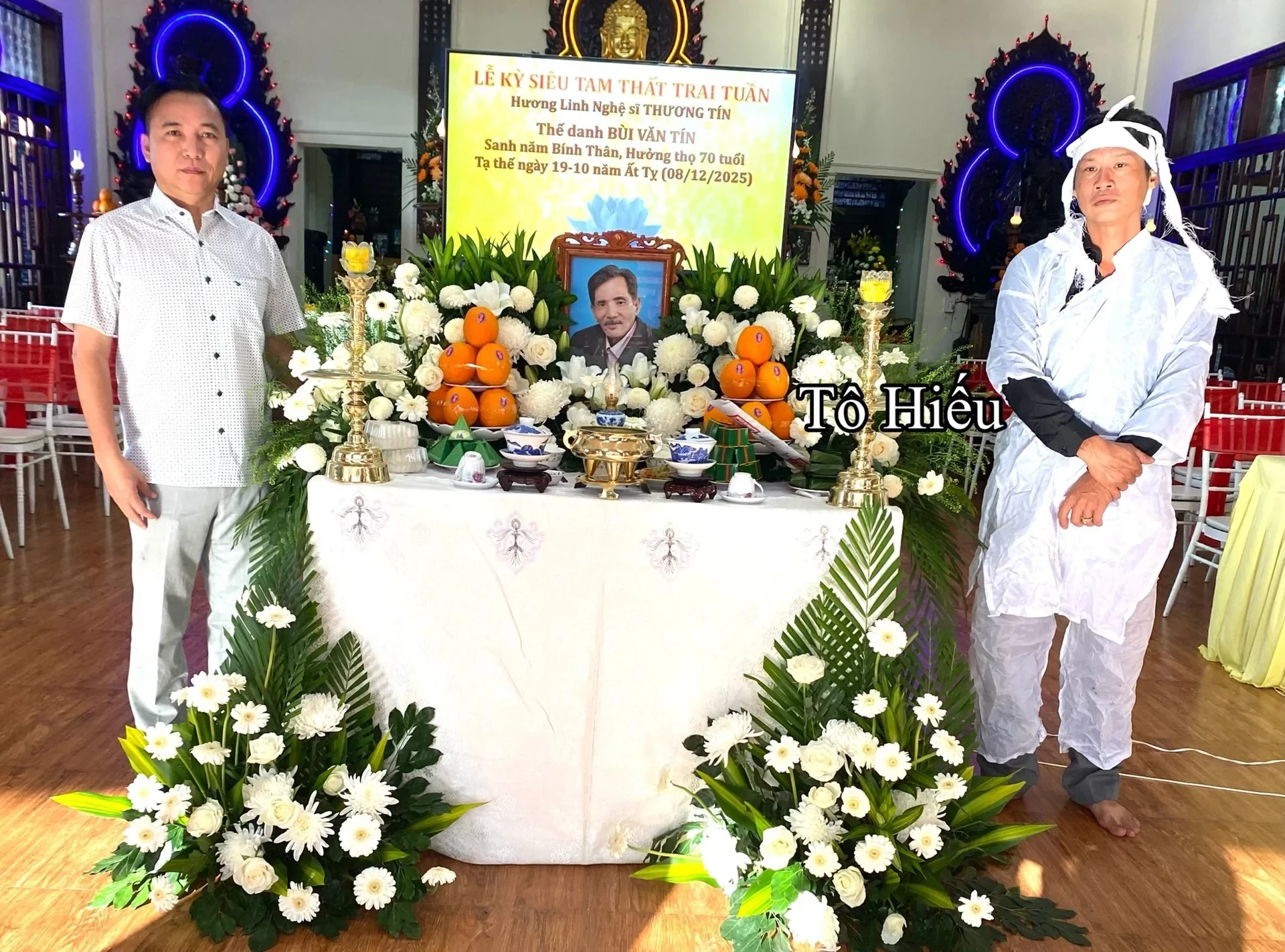 Lễ cúng tam thất của Thương Tín diễn ra trong không khí trang nghiêm, ấm cúng. Về phía gia đình cố nghệ sĩ có con trai - Thanh Tùng và con gái - Thạch Thảo. MC Quyền Linh đã thăm hỏi em trai và con trai của cố nghệ sĩ, dành những cái ôm động viên gia đình trước nỗi mất mát lớn.
