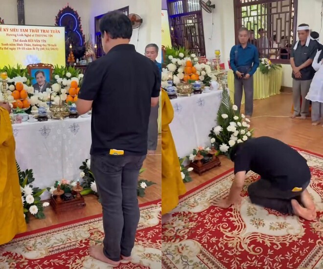 Hình ảnh Quyền Linh trong buổi cúng tam thất của đồng nghiệp khiến khán giả xúc động.