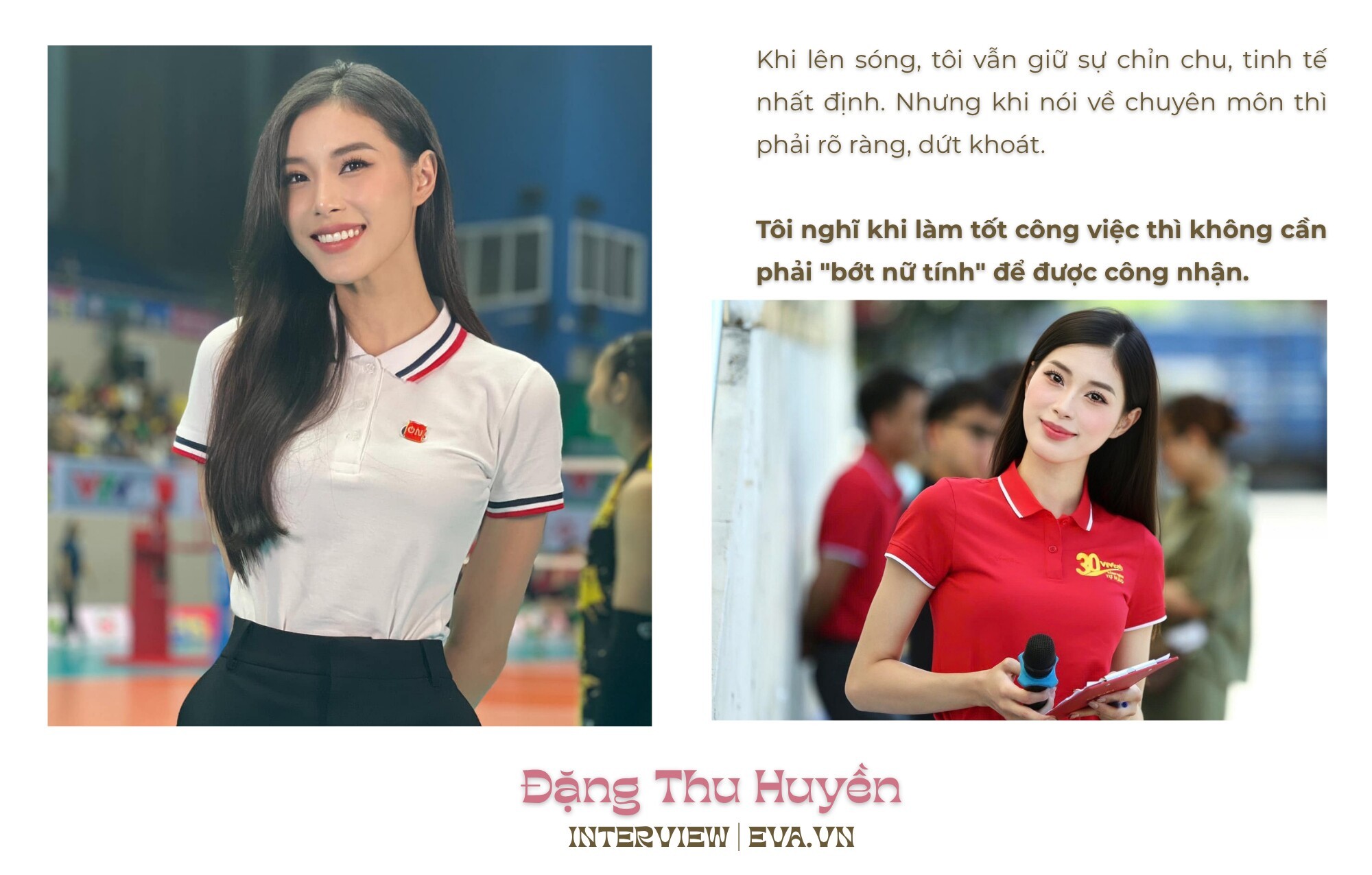 Thứ nhất là phải phù hợp với chương trình, ví dụ thể thao thì ưu tiên sự gọn gàng, năng động. Thứ hai là có thể tôn dáng, nhưng không được để trang phục lấn át nội dung mình đang nói. Và một cái rất quan trọng là phải thoải mái, vì MC thể thao không phải lúc nào cũng đứng yên. Với tôi, mặc đẹp là một chuyện nhưng mặc đúng vai trò mới là điều quan trọng hơn.