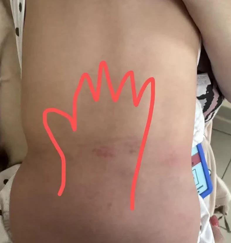 Chị Đặng kể, tối hôm đó khi đến đón con, bảo mẫu giải thích rằng vết bầm là do bé “vượt ngục”. Sau đó, cô ta nói thêm rằng bé ngủ cùng món đồ chơi có hình bàn tay, nên khi tỉnh dậy trên lưng xuất hiện vết hằn đỏ.