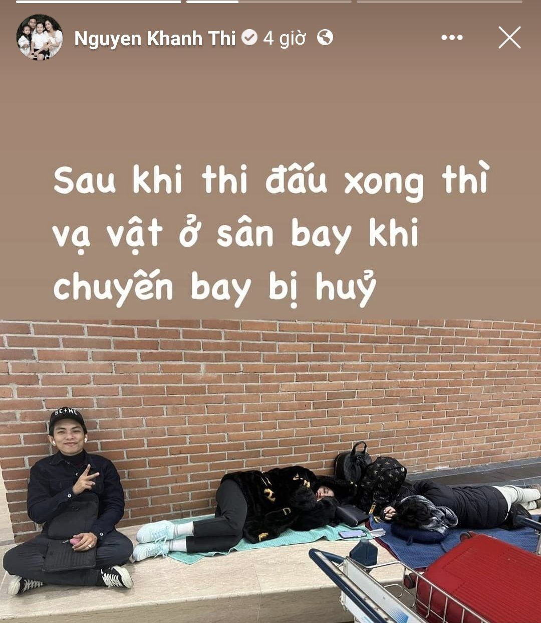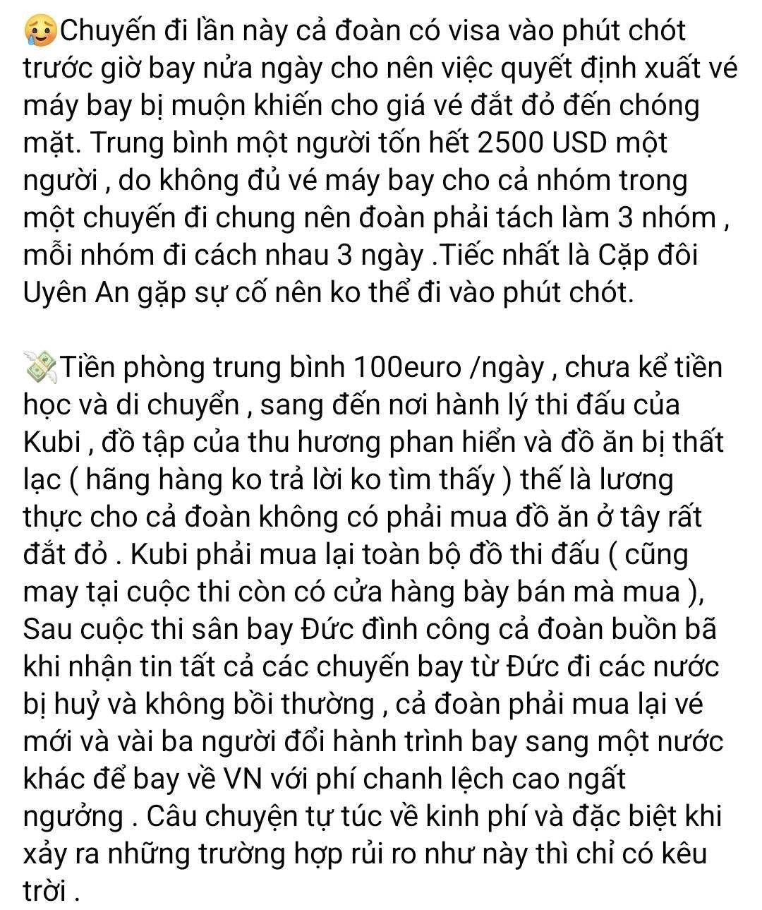 "Đáng lý ra, sáng ngày hôm qua Thi và Hiển đã bay rồi, nhưng mà sân bay Đức đình công nên Thi và Hiển bị hủy chuyến bay, phải đổi qua vé khác tốn rất nhiều tiền. Chuyến bay của Thi - Hiển là 6 giờ sáng, cả đoàn có mặt từ lúc 9 giờ tối. Rất là cực, nhà vô địch nhí đang rất trằn trọc vì không quen ngủ ở sân bay. Giờ phải đợi thêm tầm 3 tiếng đồng hồ nữa mới được check-in để bay về Việt Nam. Thế mới thấy đâu phải mang tiếng đi châu Âu là sướng đâu. Cảnh này thì Hiển đã quen rồi, chỉ tội cho mẹ Thi đang có em bé với Kubi lần đầu tiên xuất ngoại với chuyến hành trình xa và gian truân như thế", Phan Hiển viết.