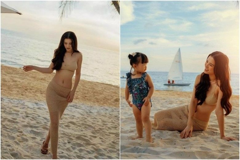 Đến khi làm mẹ, thay vì mải mê kết thân cùng những set áo tắm 2 mảnh hay 1 mảnh cơ bản như xưa, bà xã Ông Cao Thắng ưu chuộng đồ tắm cách điệu. Với combo áo bơi len móc sexy tiệp màu da, kết hợp chân váy lưới đồng điệu, bà mẹ một con khéo phô diễn eo thon, dáng gọn.