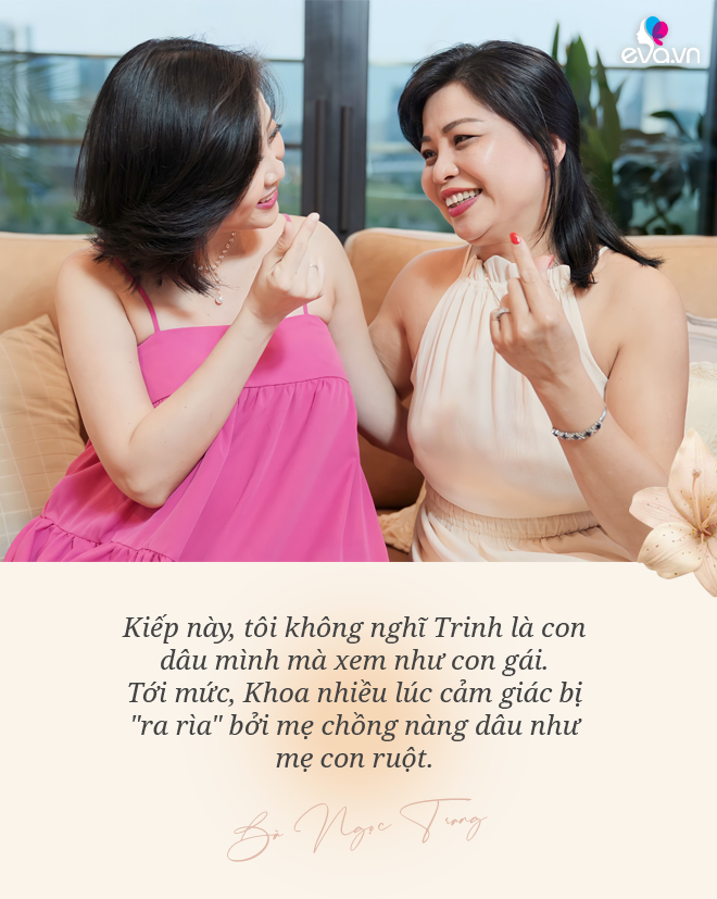 Lần đầu gặp khi Trinh đến Hà Lan thăm gia đình, tôi đã cảm nhận mình và con dâu có mối duyên, sự gắn kết đặc biệt. Tôi từng nghĩ Trinh có thể là con gái của mình kiếp trước (cười). Từ lúc Khoa gặp Trinh, tôi chưa có bất kỳ điều gì chê trách hay phàn nàn về nàng dâu này. Điều gì Trinh chưa biết thì đã có mẹ giúp đỡ, ngược lại sẽ có những điều tôi chưa rõ thì Trinh giúp mẹ. Tôi lúc nào cũng đứng sau lưng Trinh. Chẳng hạn, con không biết nấu cơm ngon thì mẹ nấu (cười). Nhiều lúc tôi thấy Trinh cố gắng lắm, thấy mẹ nấu nướng thì luôn đòi phụ dù chuyện cơm nước không phải là thế mạnh của Trinh.