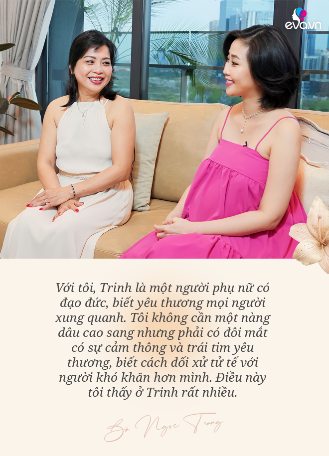 Bà Ngọc Trang: Với tôi, Trinh là người phụ nữ có đạo đức, biết yêu thương mọi người xung quanh. Tôi không cần một nàng dâu cao sang nhưng phải có đôi mắt có sự cảm thông và trái tim yêu thương, biết cách đối xử tử tế với những người khó khăn hơn mình. Điều này tôi thấy ở Trinh rất nhiều.