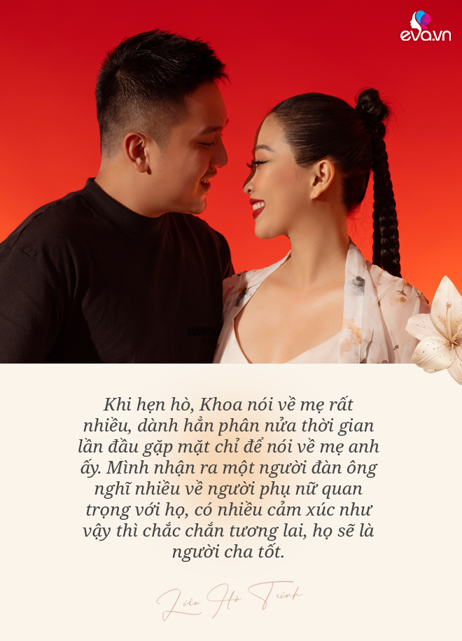 MC Liêu Hà Trinh: Trinh nghĩ mình là người may mắn (cười). Có thể Trinh có năng lượng cùng tầng số hoặc lựa chọn đúng bạn đời. Lần đầu tiên gặp Khoa, anh ấy không nói về bản thân, thế mạnh hay những chiến tích tình trường như những người hay "quét" app hẹn hò. Anh ấy nói về mẹ rất nhiều, dành phân nửa thời gian của lần đầu gặp mặt chỉ để nói về mẹ. Anh thương bà vì vất vả lo cho con cháu, chia sẻ ảnh của mẹ và kể chuyện gia đình tại Hà Lan.