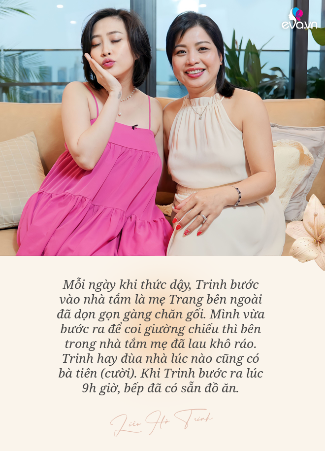 MC Liêu Hà Trinh: Mẹ Trang thể hiện sự yêu thương bằng hành động mỗi ngày, mỗi giờ. Khi Trinh thức dậy, bước vào nhà tắm là mẹ Trang bên ngoài đã dọn gọn gàng chăn gối. Mình vừa bước ra để coi giường chiếu thì bên trong nhà tắm mẹ đã dọn sạch sẽ, khô ráo. Trinh hay đùa nhà lúc nào cũng có bà tiên (cười). Khi Trinh bước ra lúc 9 giờ sáng, bếp đã có sẵn đồ ăn.
