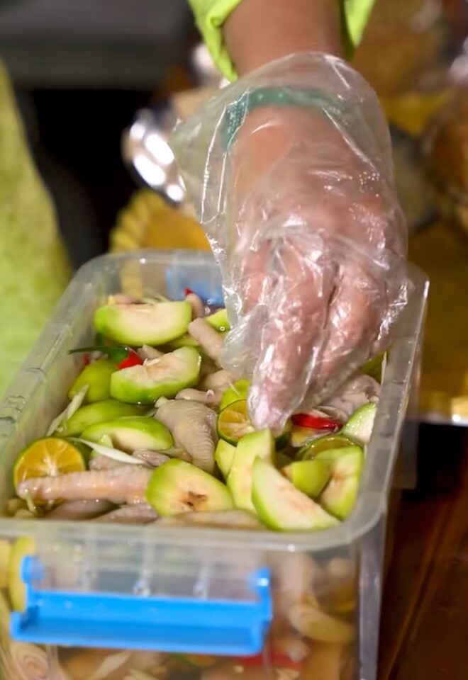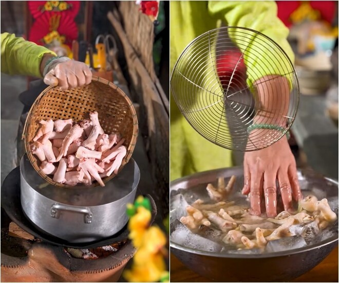 Bí quyết để chân gà giữ được độ giòn "sần sật" chính là khâu luộc với gừng để khử mùi, sau đó "thảy vô cái thau nước đá liền". Nghệ sĩ cho hay: "Đừng có luộc lâu quá là bở rệt, nó không có ngon đâu".