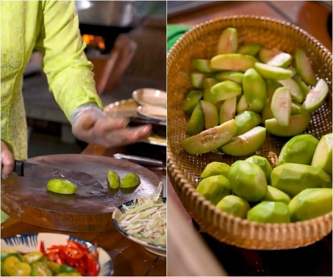 Cóc sau khi rửa sạch sẽ được gọt vỏ và bổ miếng vừa ăn. Nữ diễn viên cả, ớt cắt mỏng để cho món ăn thấm và thơm.