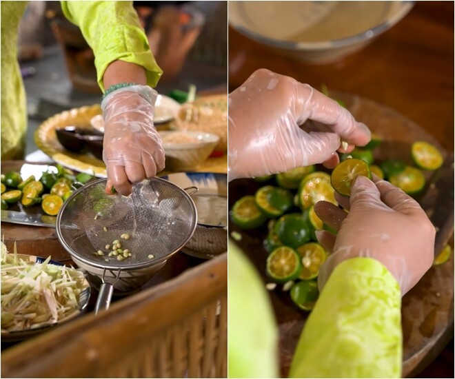 Tắc (quất) một nửa vắt lấy nước, một nửa xắt lát. Nghệ sĩ Ngân Quỳnh rất tỉ mỉ trong khâu sơ chế để món ăn không bị đắng hay nhớt. Cô lưu ý các chị em khi làm tắc phải "lể cái hột ra cho sạch nha mấy bà, chứ không thôi ăn vô một cái là nó đắng thấu trời luôn".