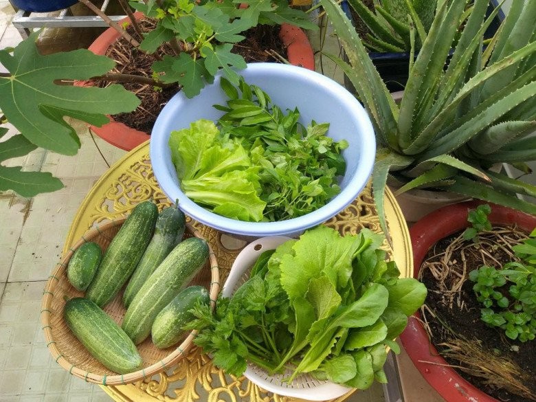 Chỉ cần bước lên sân thượng là nhà chị Tuyền đã có rau ăn, phục vụ cho mỗi bữa cơm trong gia đình.