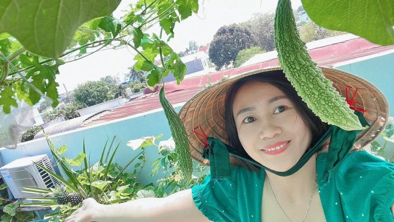 Mẹ đảm Bình Dương cho biết, khu vườn nhỏ của chị cỡ 50m2. Khi biết chị làm vườn trên sân thượng, ban đầu ông xã chị không hề ủng hộ, một phần vì thương vợ ngày đi làm vất vả về nhà còn làm vườn, sợ vợ mệt; một phần là sợ về lâu về dài trồng rau tưới nước nhiều sẽ thấm nước xuống sàn, làm hỏng sân thượng.
