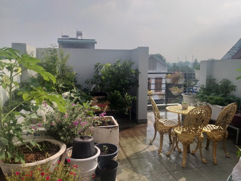 Khoảng sân trước trên sân thượng, chị Tuyền trồng một số loại cây ăn quả, điểm xuyết vài chậu hoa như hoa hồng, mười giờ,... Tại đây chị còn đặt một bộ bàn ghế để thỉnh thoảng lên đây ngồi "chill chill".