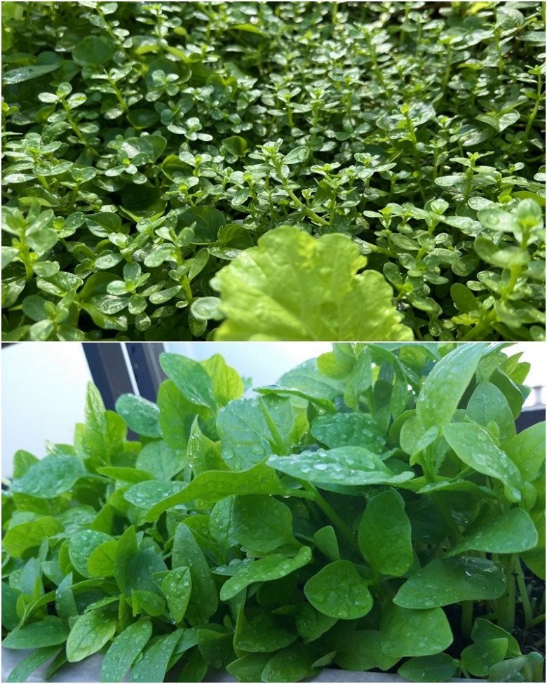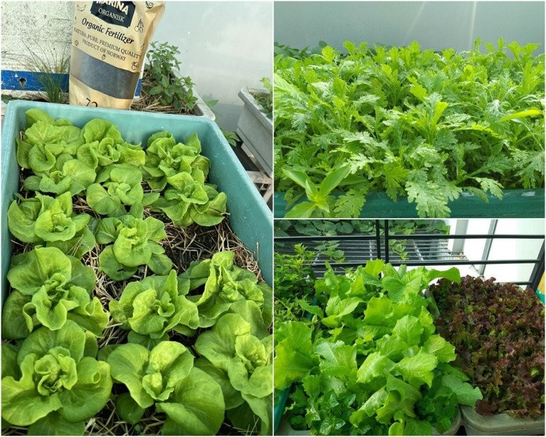Sân thượng nhà chị Tuyền có đủ loại rau xanh như mồng tơi, xà lách, rau cúc, rau cải,... loại nào cũng xanh mướt mát.