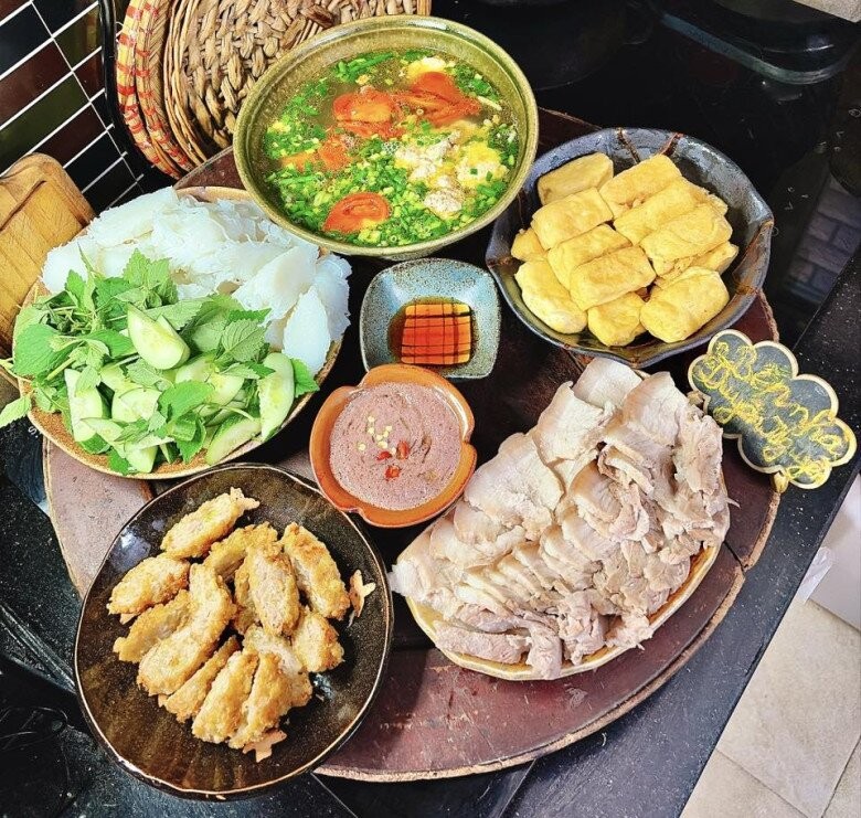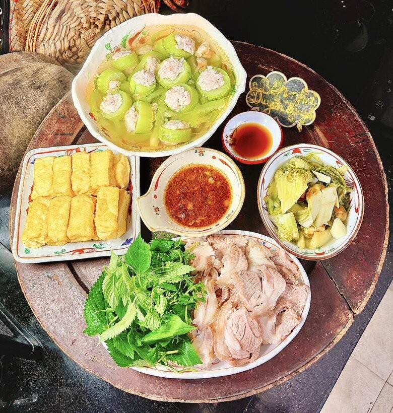 Mâm cơm này gồm các món: - Bún đậu mắm tôm ăn cùng thịt ba chỉ luộc, chả cốm Tú Lệ, đậu phụ chiên. - Canh riêu cua
