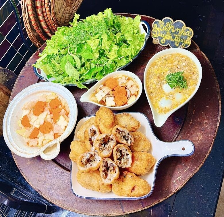 Mâm cơm này gồm các món: - Bánh rán mặn - Súp gà ngô nấm
