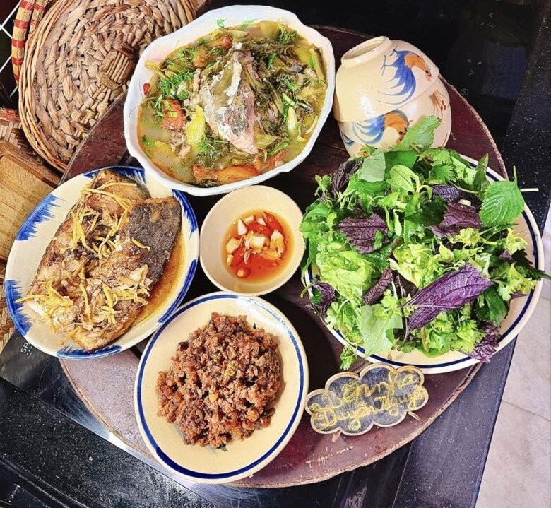 Mâm cơm này gồm các món: - Cá chép chiên mắm gừng - Thịt chưng mắm tép - Đầu cá chép om dưa
