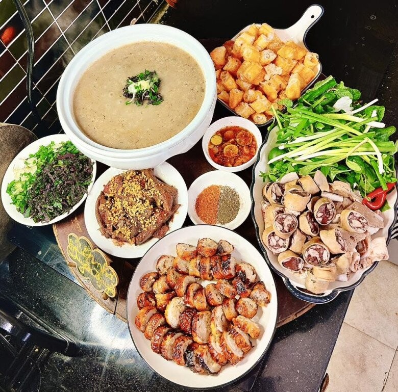Mâm cơm này gồm các món: - Lòng chần cháo - Nõn đuôi nhồi thịt nướng - Gan cháy tỏi