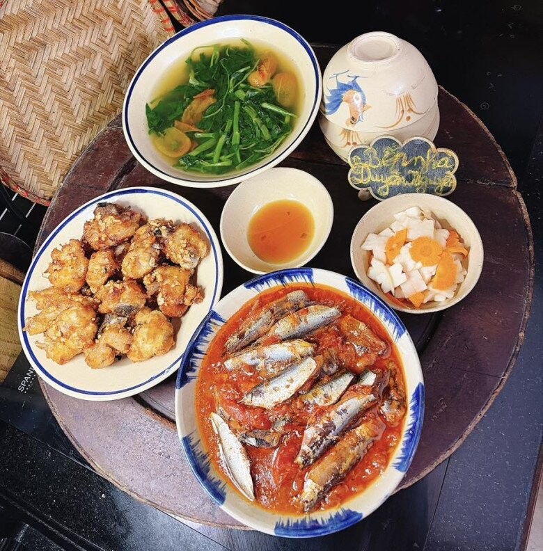 Mâm cơm này gồm các món: - Cá trích hầm cà chua - Gà chiên mắm tỏi - Canh rau muống
