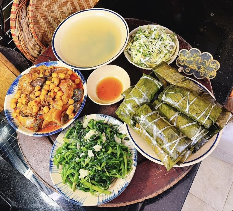 Mâm cơm này gồm các món: - Thịt chân giò hầm nấm hương hạt sen - Rau muống xào - Bánh sắn - Dưa bắp cải rau cần muối