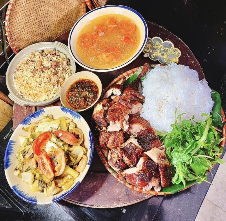 Mâm cơm này gồm các món: - Thịt vịt quay - Dưa xào tóp mỡ - Cơm rang thịt vịt - Canh chua