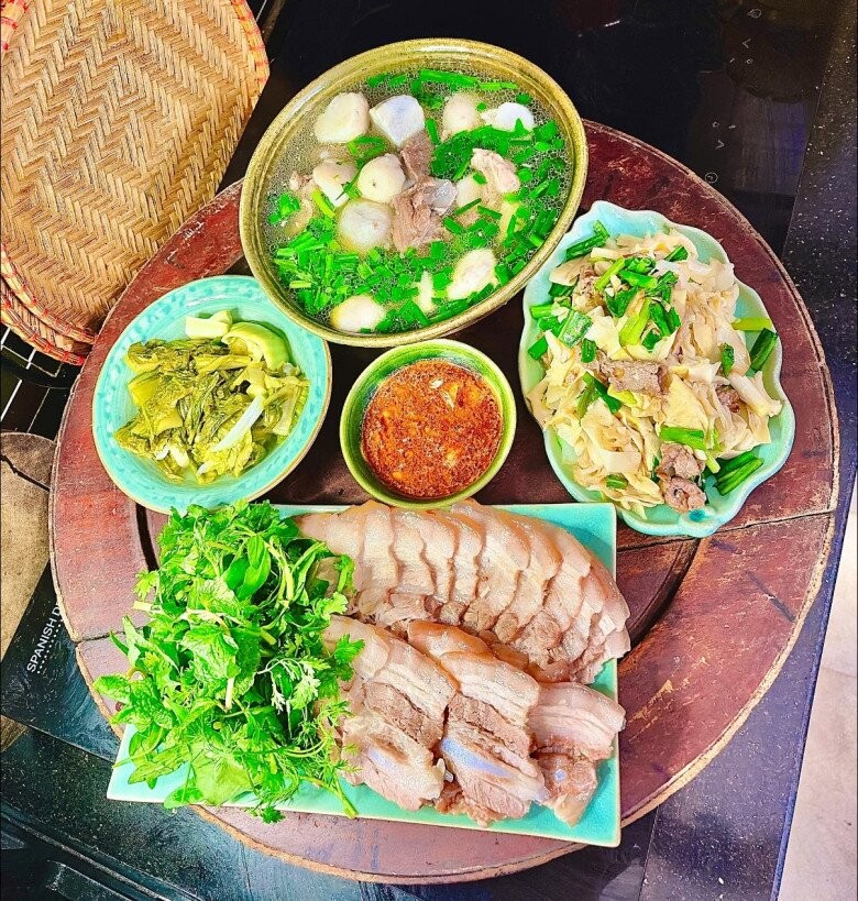 Mâm cơm này gồm các món: - Ba rọi lợn mán hấp hành gừng - Măng đắng xào bò - Canh khoai sọ nấu xương