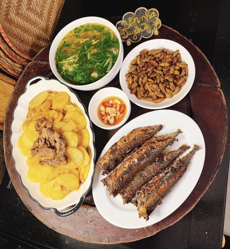 Mâm cơm này gồm các món: - Cá nục chiên riềng sả - Khoai tây xào thịt bò - Nhộng rang - Canh măng mọc