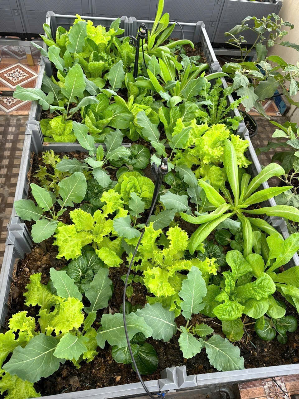 “Mình đầu tư tốn nhất về chậu ghép vì ban đầu mình trồng rau trong thùng xốp thì nhanh bị vỡ, văng đất bẩn nên mình quyết định đầu tư chậu ghép và hệ thống tưới tự động cho sạch đẹp. Bởi sạch sẽ, gọn gàng giúp khu vườn sạch đẹp và tạo hứng thú cho việc làm vườn về sau, nếu bừa bộn sẽ nhanh chán lắm”, chị Hương nói.