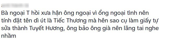 Cư dân mạng này cho biết, vì ông ngoại của cô phản bội bà ngoại nên suýt chút nữa, dì út đã được đặt cái tên là Tiếc Thương. Tuy nhiên, sau khi ra xã làm giấy khai sinh và đặt tên, bà ngoại đã được nhân viên khéo léo tư vấn sửa thành một cái tên khác rất hay lại ý nghĩa.