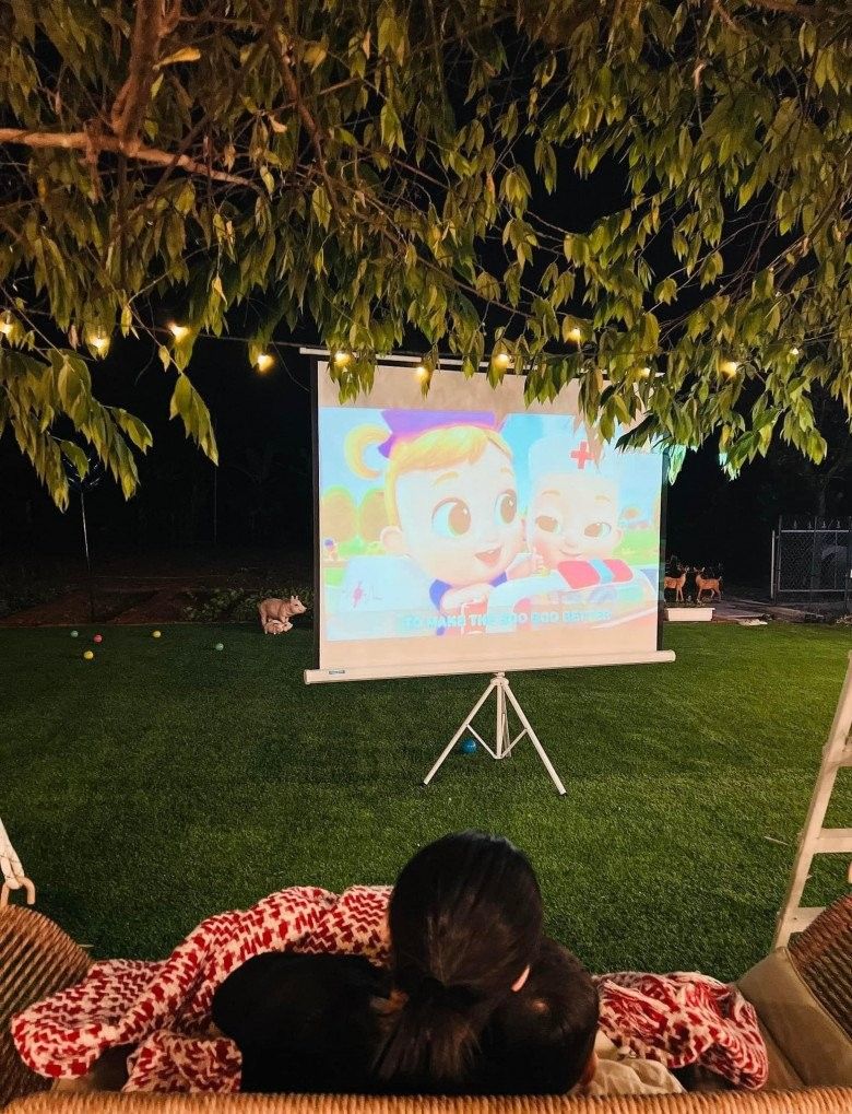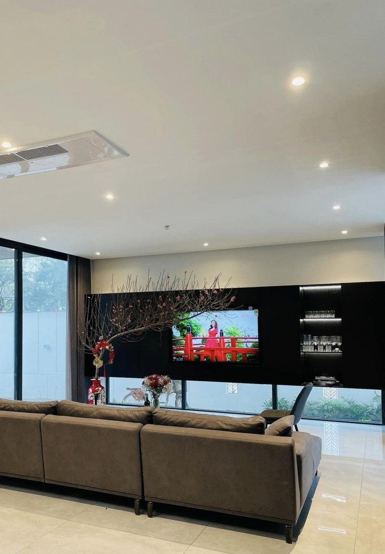 Những năm tháng sống ở thành phố "đất chật người đông", chị Hoa đã luôn ấp ủ dự định xây dựng một ngôi nhà rộng rãi, có đủ không gian để các con vui đùa. Trước nhà là khoảng sân rộng để các con thoải mái chạy nhảy, vui đùa. Từ phòng khách nhìn ra sẽ thấy bể bơi nhỏ ở phía sau. Tại đây, chị Hoa đặt bếp nướng để gia đình tổ chức những buổi tiệc BBQ ngoài trời.