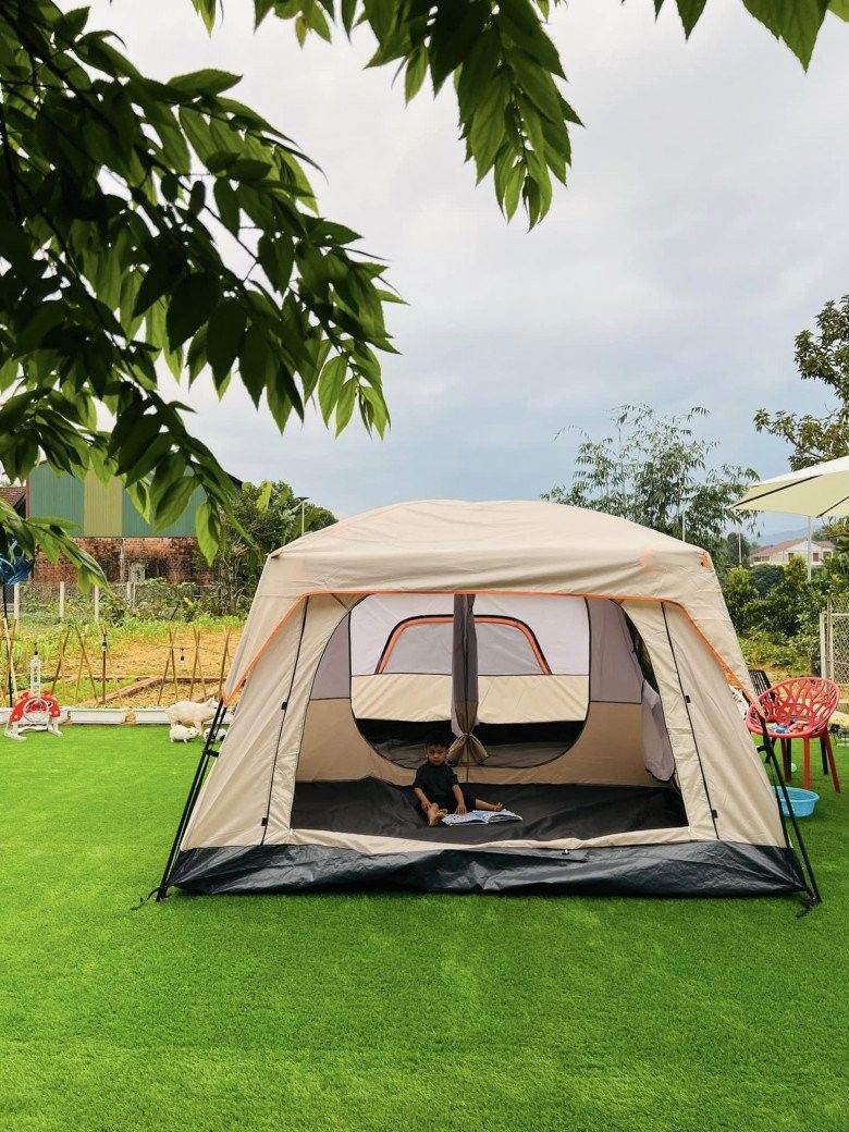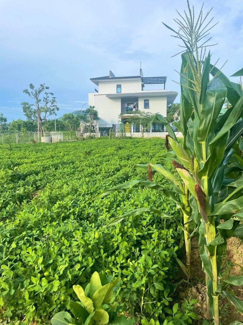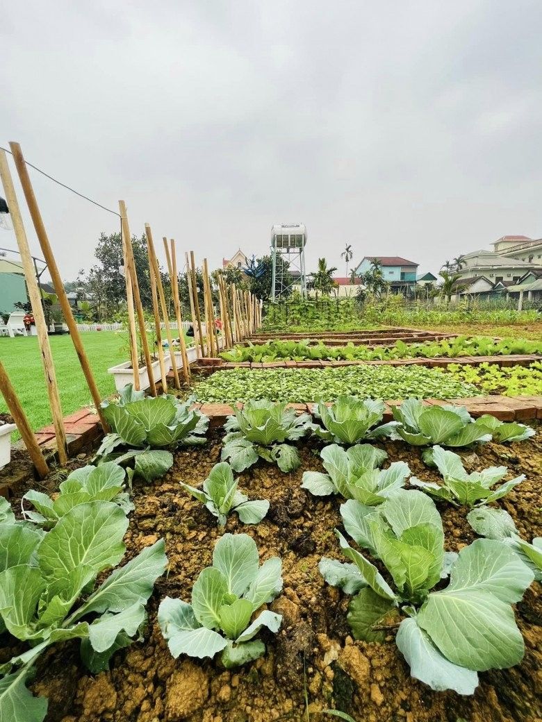 Đặc biệt, chị Hoa còn có khoảng 2000m2 vườn. Thời gian đầu, chị dành toàn bộ diện tích này để trồng rau xanh và cây ăn trái. Tuy nhiên, sau một năm trồng trọt, mẹ đảm cảm thấy hơi "phí" vì sản lượng rau vượt quá nhu cần sử dụng của gia đình. Thế là, chị quyết định cải tạo lại vườn, dành ra một phần đất trồng rau. Phần còn lại, chị làm sân chơi cho con, vừa là nơi để mẹ đảm thả hồn vào thiên nhiên, thư giãn và nghỉ ngơi.