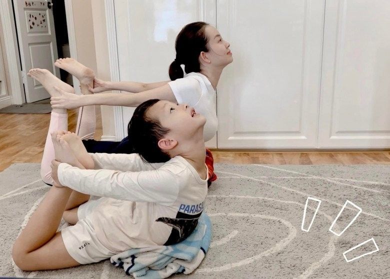 Không chỉ tự tập luyện tại nhà, Ly Kute cũng đã sớm tập cho con trai thói quen giúp nâng cao độ dẻo dai của cơ thể này.