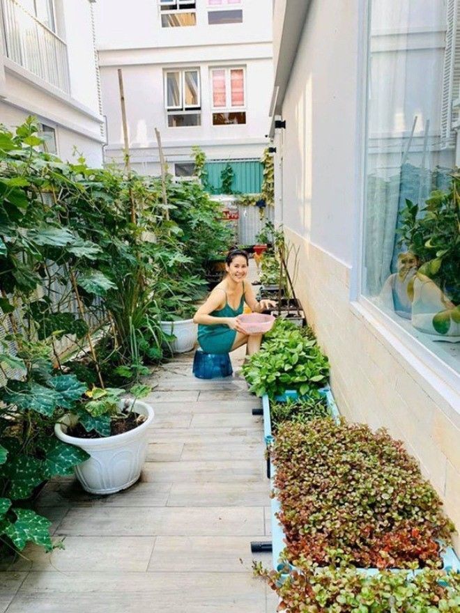 Khuôn viên trong biệt thự rộng rãi, Thân Thúy Hà đã tận dụng khoảng sân nhỏ bên hông trồng nhiều loại rau như bí đỏ, mồng tơi, cà tím, cải xanh, đậu rồng, dưa leo, khổ qua và các loại rau gia vị để gia đình sử dụng. Nữ diễn viên áp dụng quy trình chăm sóc đơn giản gồm các bước: làm đất, gieo hạt, sau đó duy trì tưới nước hai lần mỗi ngày, đợi cây ra hoa sẽ bón phân.