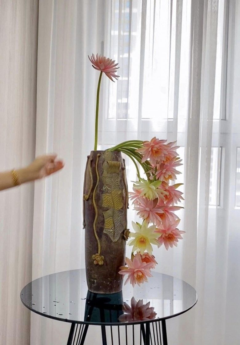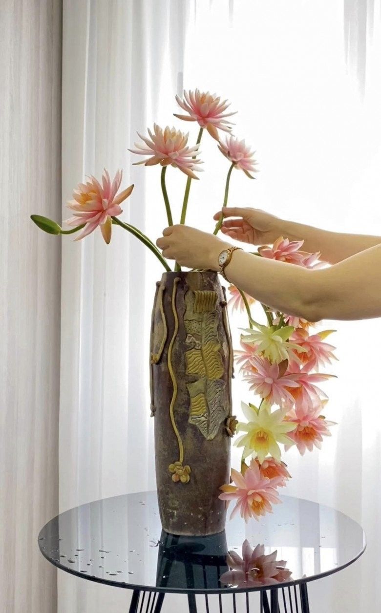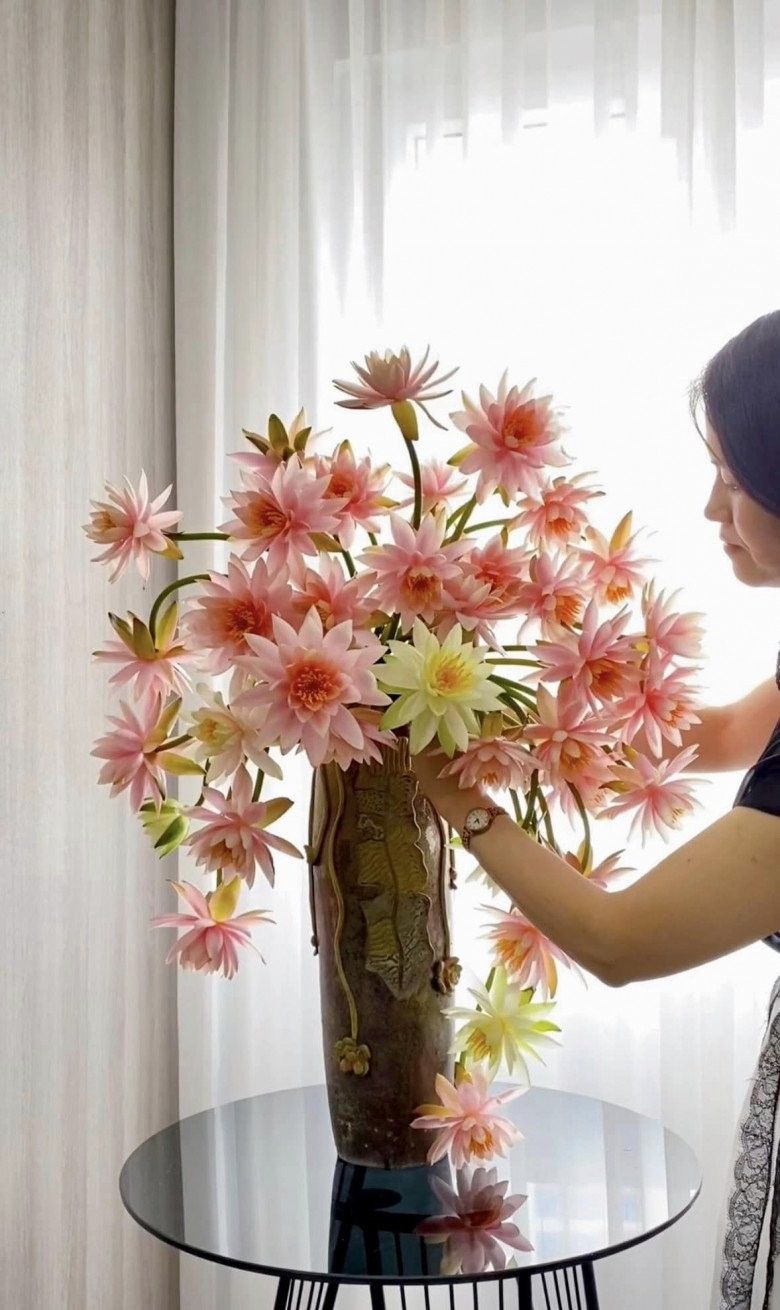 "Cành hoa súng cong mình hay cắm rủ tự nhiên, cong vừa cắm xung quanh và thẳng cắm thẳng và xiên để tạo dáng bình hoa cho mềm mại", chị bật mí bí quyết.
