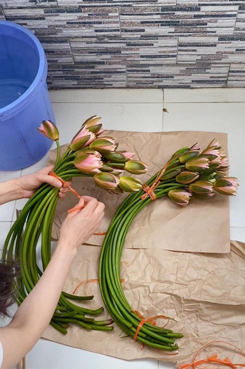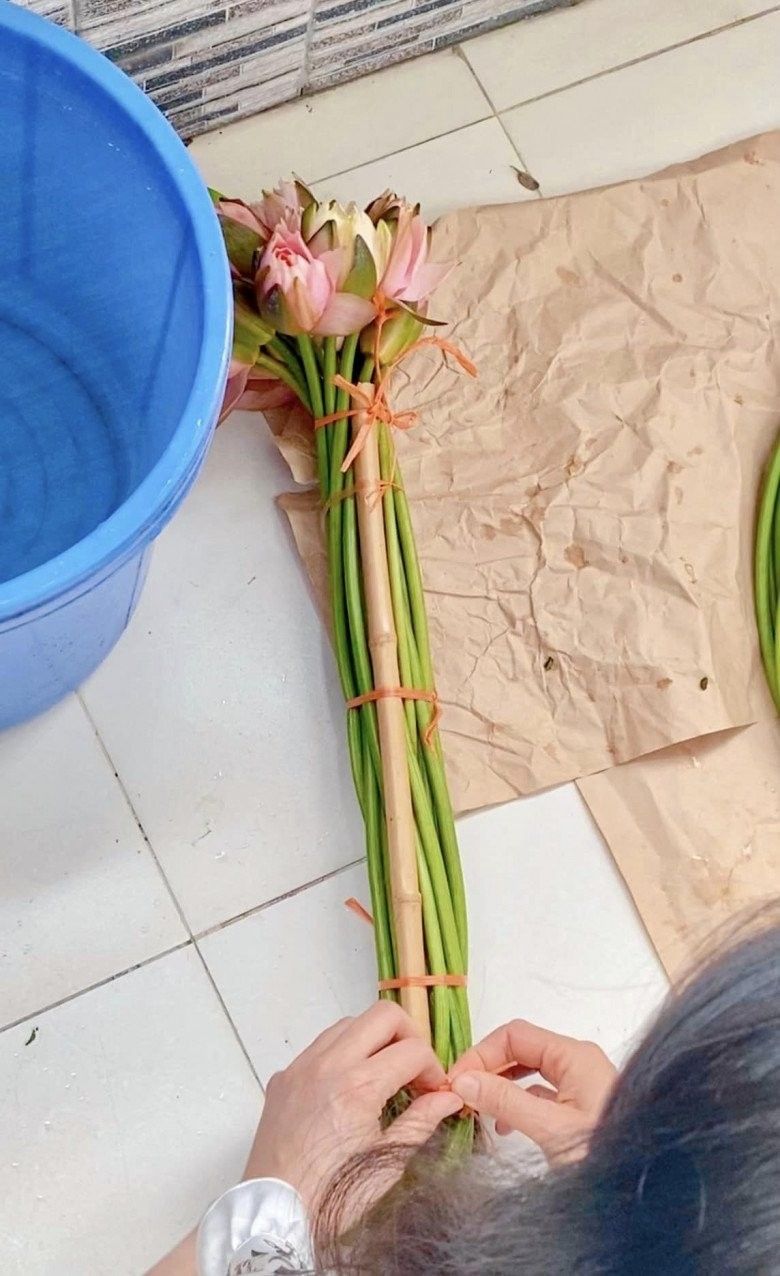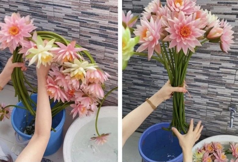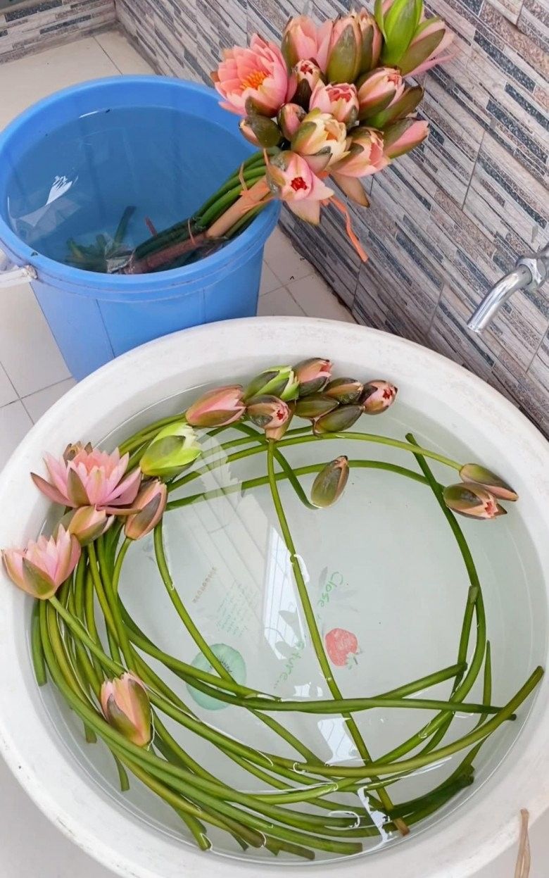 Mẹ đảm chia đôi bó hoa, một phần ngâm thả tự do trong nước để có được độ cong mềm. Một phần chị cố định bằng que để nắn thẳng cành hoa. Tất cả cành súng đều được ngâm ngập đến hoa. Chị Hà chia sẻ: "Súng bền khoảng 4-5 hôm nếu tối ngâm dưỡng bằng nước sạch gần đến cổ hoa. Nếu không ngâm qua đêm mà cắm liền thì súng chỉ được 1 ngày là héo".
